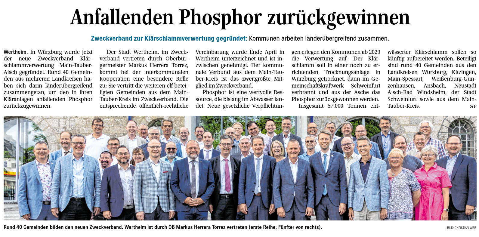 Oberbürgermeister Markus Herrera Torrez betonte die Bedeutung der Zusammenarbeit und die neuen gesetzlichen Vorgaben zur Phosphorrückgewinnung. Tina Hörner, Betriebsleiterin der Abwasserbeseitigung Wertheim, hob die Vorteile des Zweckverbands wie langfristige Preissicherheit und kurze Transportwege hervor. Der entwässerte Klärschlamm wird zur Trocknungsanlage in Würzburg und anschließend zur Verbrennung nach Schweinfurt gebracht. Die Asche wird zur Phosphorrückgewinnung verwendet.