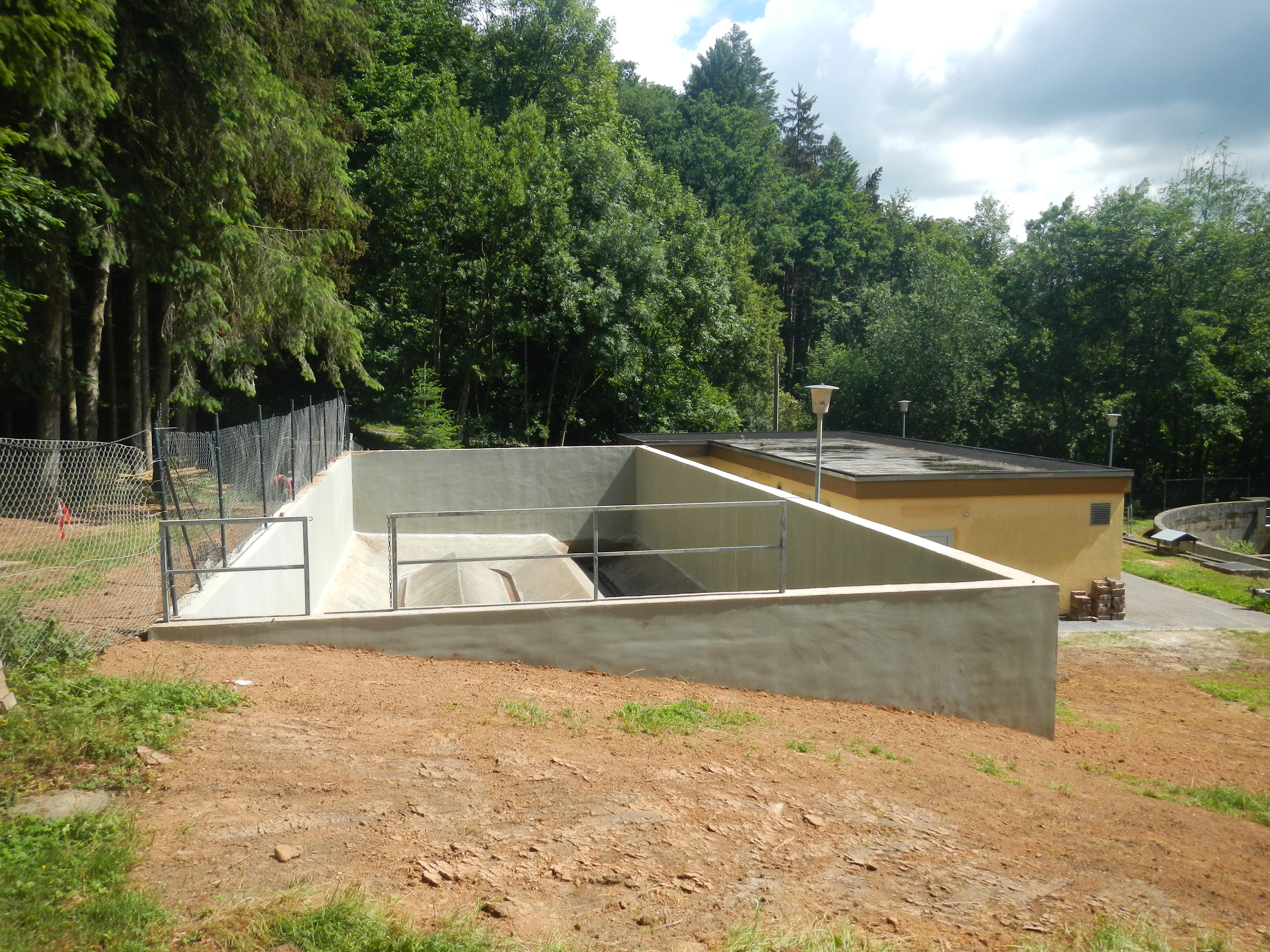 Bei der Sanierung wurde der geschädigte Beton durch Höchstdruckwasserstrahlen bis auf eine Tiefe von maximal 10 cm abgetragen und durch eine Spritzmörtelschicht ersetzt.Insgesamt wurde eine Fläche von etwa 258 m² auf diese Weise saniert.Im Zuge der Sanierung wurden außerdem Instandhaltungsarbeiten am Betriebsgebäude sowie am umlaufende Maschendrahtzaun durchgeführt.