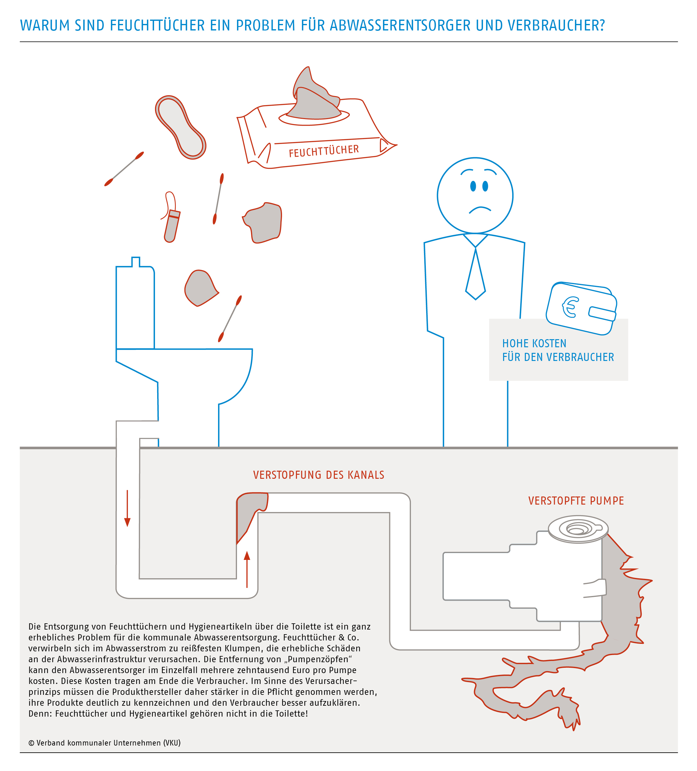 Anders als teilweise von den Herstellern propagiert, sind Feuchttücher nicht leicht löslich und können sich daher mit anderen Abfallstoffen verbinden und so den Kanal und die Pumpen verstopfen (siehe Schaubild).